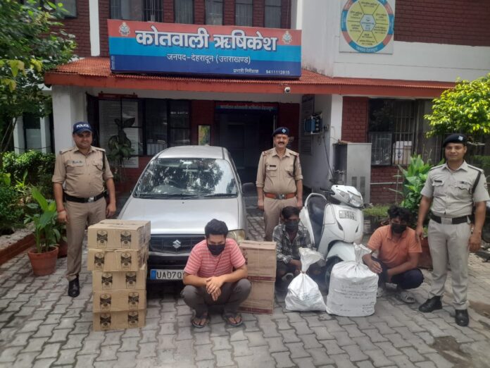 ऋषिकेश पुलिस द्वारा चैकिंग के दौरान अलग अलग स्थानों, गोविन्द नगर झुग्गी झोपडी, गोल चक्कर आईडीपीएल व आशुतोष नगर ऋषिकेश से 03 अभियुक्तों को 09 पेटी अवैध देसी/अंग्रेजी शराब की तस्करी करते हुये गिरफ्तार किया गया, अभियुक्तो द्वारा तस्करी में प्रयुक्त की जा रही ऑल्टो कार व स्कूटी को सीज किया गया।