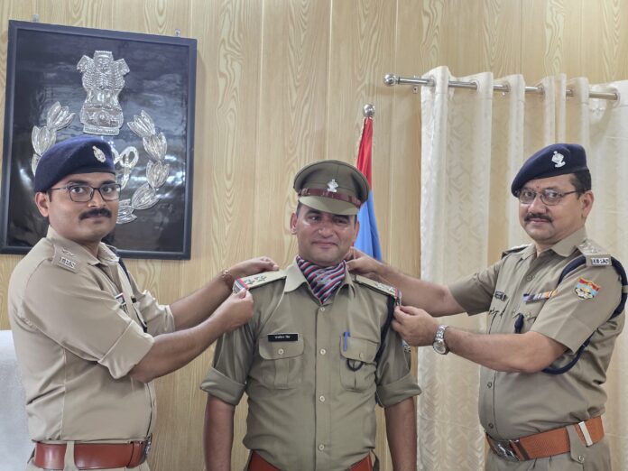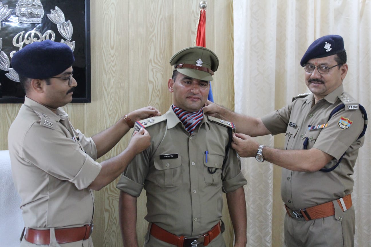 जनपद रुद्रप्रयाग में नियुक्त मुख्य आरक्षी स.पु. के अपर उपनिरीक्षक स.पु. पद पर पदोन्नत होने पर पुलिस कार्यालय में आयोजित पिपिंग सेरेमनी के दौरान एसपी रुद्रप्रयाग ने उनके कंधों पर सजाए सितारे।