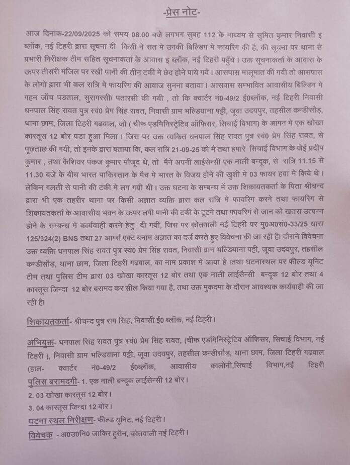 आज दिनांक-22/09/2025 को समय 08.00 बजे लगभग सुबह 112 के माध्यम से सुमित कुमार निवासी इ ब्लॉक, नई टिहरी द्वारा सूचना दी किसी ने रात मे उनकी बिल्डिग में फायरिंग की है, की सूचना पर थाना से प्रभारी निरीक्षक टीम सहित सूचनाकर्ता के आवास इ ब्लॉक, नई टिहरी पहुँचे। उक्त सूचनाकर्ता के आवास के ऊपर तीसरी मंजिल पर रखी पानी की तीन टंकी में छेद होने पाये गये। आसपास मालूमात की गयी तो आसपास के लोगो द्वारा भी कल रात्रि मे फायरिंग की आवाज सुनना बताया। आसपास सम्भावित आवासीय बिल्डिग मे गहन जाँच पडताल, सुरागरसी/ पतारसी की गयी, तो कि क्वार्टर नं0-49/2 ई०ब्लॉक, नई टिहरी निवासी धनपाल सिंह रावत पुत्र स्व० प्रेम सिंह रावत, निवासी ग्राम भल्डियाना पट्टी, जूवा उदयपुर, तहसील कन्डीसौड़, थाना छाम, जिला टिहरी गढवाल, जो (चीफ एडमिनिस्ट्रेटिव ऑफिसर, सिचाई विभाग) के आंगन में एक खोखा कारतूस 12 बोर पडा हुआ मिला। जिस पर उक्त व्यकित धनपाल सिंह रावत पुत्र स्वं० प्रेम सिंह रावत, से पूछताछ की गयी, तो इनके द्वारा बताया कि, कल रात्रि 21-09-25 को मै तथा हमारे सिचाई विभाग के जेई प्रदीप कुमार, तथा कैशियर पंकज कुमार मौजूद थे, तो मैने अपनी लाईसेन्सी एक नाली बन्दूक, से रात्रि 11.15 से 11.30 बजे के बीच भारत पाकिस्तान के मैच में भारत के विजय होने की खुशी मे 03 फायर हवा मे किये थे। लेकिन गलती से पानी की टंकी में लग गयी थी। उक्त घटना के सम्बन्ध में उक्त शिकायतकर्ता के पिता श्रीचन्द द्वारा भी एक तहरीर थाना पर किसी अज्ञात व्यक्ति द्वारा कल रात्रि मे फायरिंग करने तथा फायरिंग से शिकायतकर्ता के आवासीय भवन के ऊपर लगी पानी की टंकी के टूटने तथा फायरिंग से जान को खतरा उत्पन्न होने के सम्बन्ध मे कार्यवाही करने हेतु दी गयी, जिस पर कोतवाली नई टिहरी पर मु0अ0सं0-33/25 धारा 125/324(2) BNS तथा 27 आर्म्स एक्ट बनाम अज्ञात का दर्ज करते हुए विवेचना की जा रही है। दौराने विवेचना उक्त व्यक्ति धनपाल सिंह रावत पुत्र स्वं० प्रेम सिंह रावत, निवासी ग्राम भल्डियाना पट्टी, जूवा उदयपुर, तहसील कन्डीसौड़, थाना छाम, जिला टिहरी गढवाल, का नाम प्रकाश में आया है। तथा घटनास्थल पर फील्ड यूनिट टीम तथा पुलिस टीम द्वारा 03 खोखा कारतूस 12 बोर तथा एक नाली लाईसेन्सी बन्दूक 12 बोर तथा 4 कारतूस जिन्दा 12 बोर बरामद कर सील किया गया है, तथा उक्त मुकदमा के दौरान आवश्यक कार्यवाही की जा रही है।