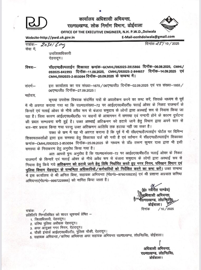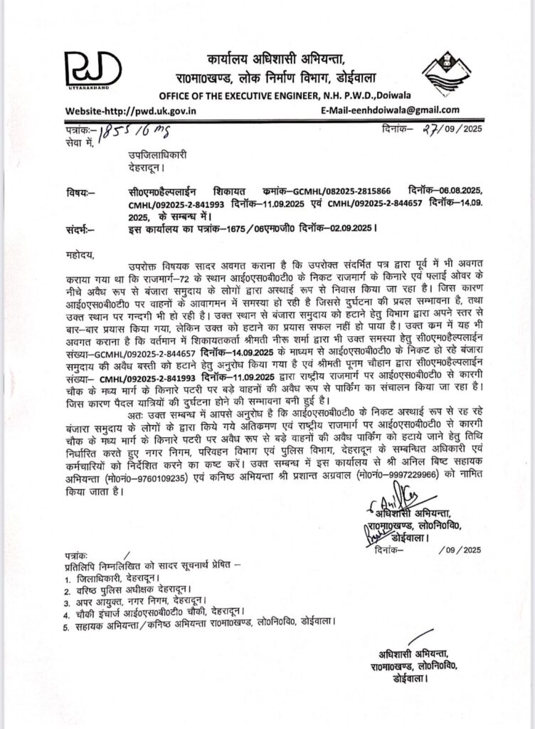 में अधिशासी अभियंता श्री नवनीत पाण्डेय ने स्पष्ट किया है कि हाईवे संख्या-72 पर कारगी चौक से लेकर आईएसबीटी फ्लावर) के निकट अवैध रूप से ट्रकों, अन्य गाड़ियों और बंजार समुदाय द्वारा निवास कर अतिक्रमण किया गया है।