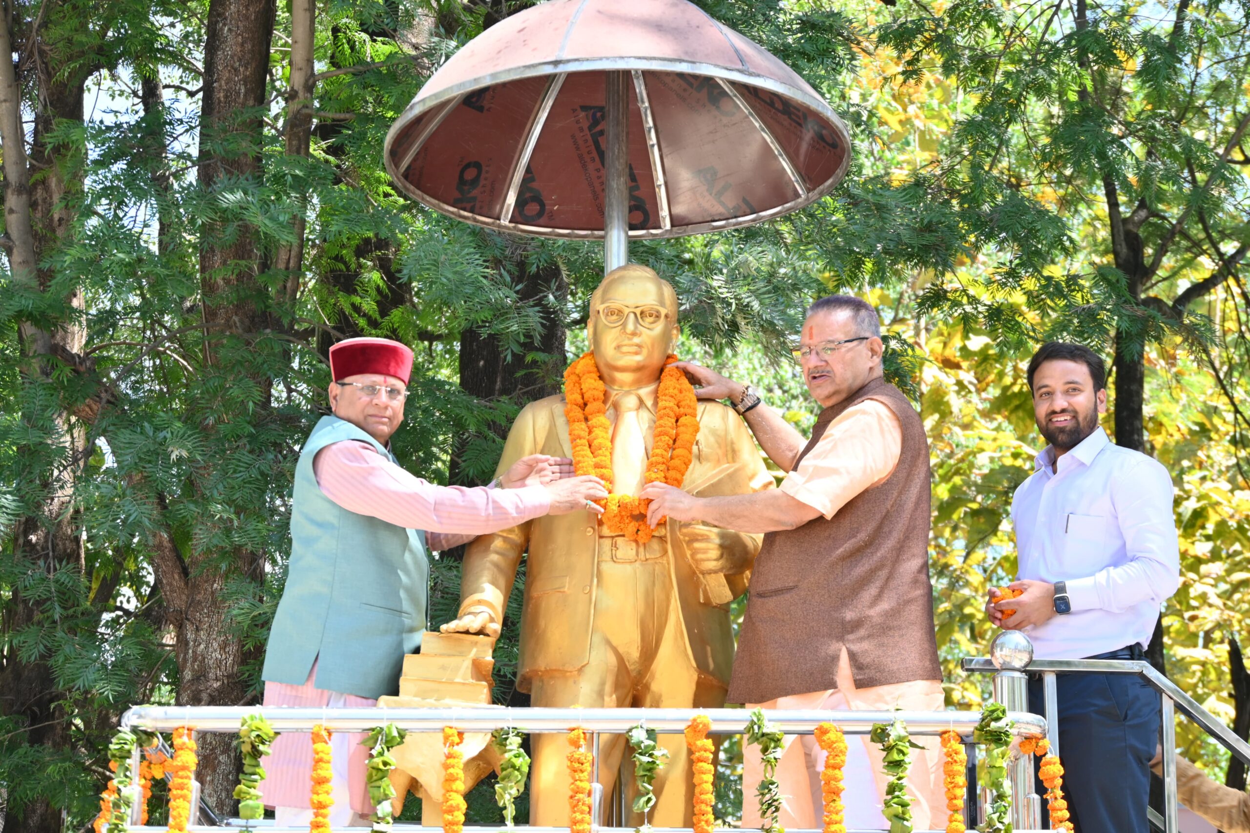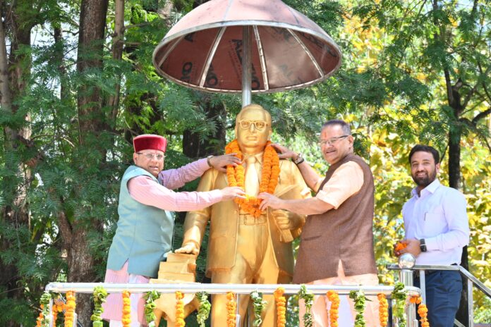 बाबा साहेब अंबेडकर जयंती के अवसर पर गढ़ी कैंट में उनकी प्रतिमा पर माल्यार्पण कर उन्हें श्रद्धांजलि देते कैबिनेट मंत्री गणेश जोशी और कैबिनेट मंत्री खजान दास